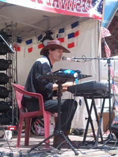 | Mais on le sait – et ainsi l’aurait voulu le Père Delétang – the show must go on. Alors le show a continué. Avec l’atterrissage des parapentes et de leurs immenses drapeaux français et américains et les hymnes de ces deux pays alliés magnifiquement interprétés par Lilly West. Avec, pendant le repas et sous un soleil westernien, un concert de Pierre Lorry, « The West Singer », qui se bonifie – et Dieu sait s’il est épatant – d’année en année. De la danse ? Oui. Mais de la danse country. Avec Kenny et Cyrille Dupuy aux manettes, pas de risque de s’égarer vers des musiquettes pour remueurs de popotins ! Ce Festival annonce la couleur : il est country, il est western, il a pour trail boss Daniel, un authentique westerner. Pas question de dériver vers des trucs genre trabadja la mouquère comme on voit avec horreur ici et là. L’après-midi, remarquable spectacle équestre avec la troupe « Caballeros A Caballos » (que l’on a retrouvée plus longuement le dimanche). Et puis, doucettement, à la fraîche (manière de dire car il fait très chaud à Montclar), un repas concert avec Mr. Jay and Guests : du solide, du sérieux, de l’authentique. Et pour suivre ? Rien moins que Marie Dazzler, qui chante avec les anges, auteur, compositeur, interprète, appuyée par un multi-instrumentiste de génie, Bruno Liger. De The End à Crawfish Rendez-Vous en passant par The Sunny Side Of Life, etc., elle nous a scotchés. Quant à son interprétation de Malaguena, j’en ai encore la chair de poule… |